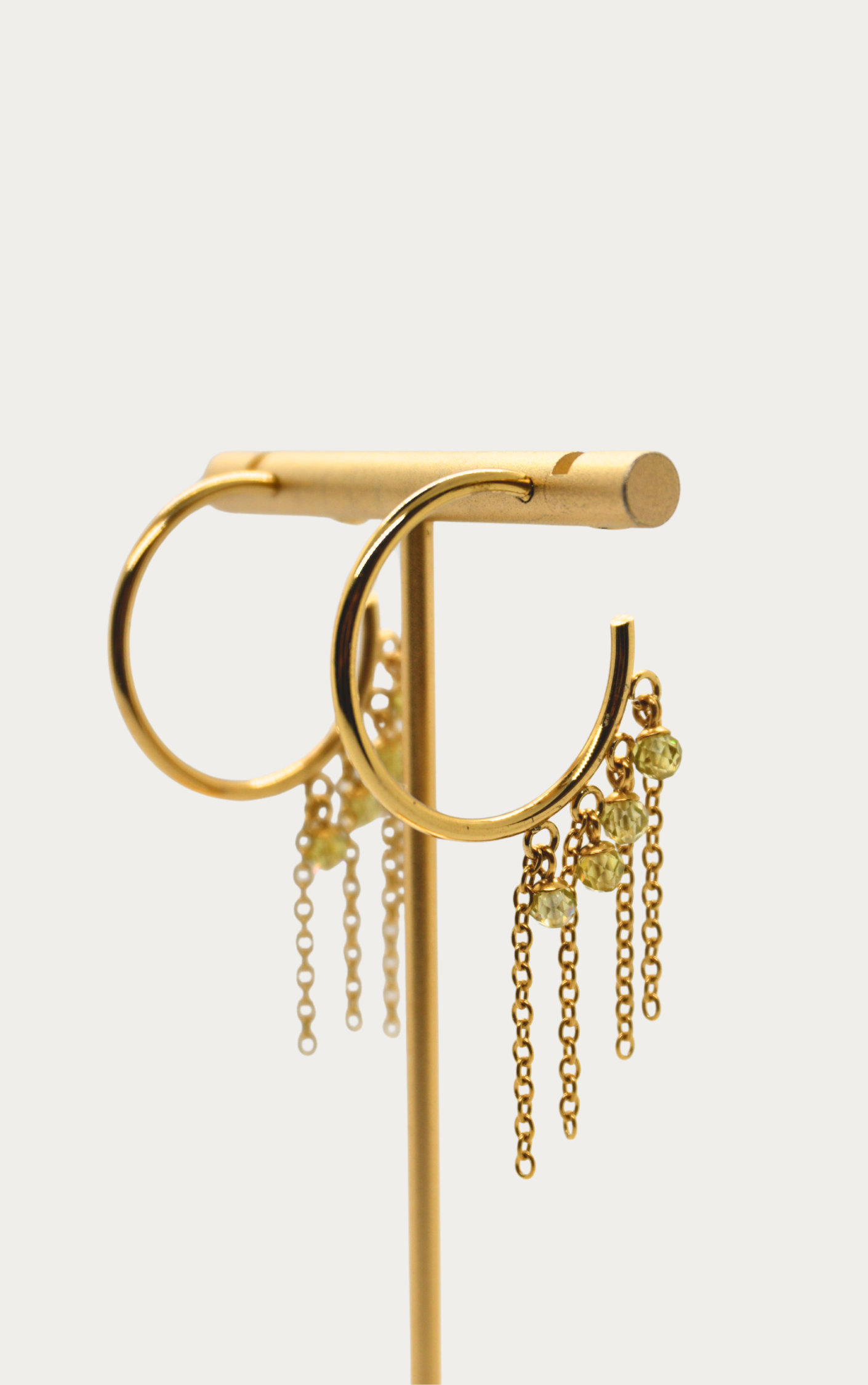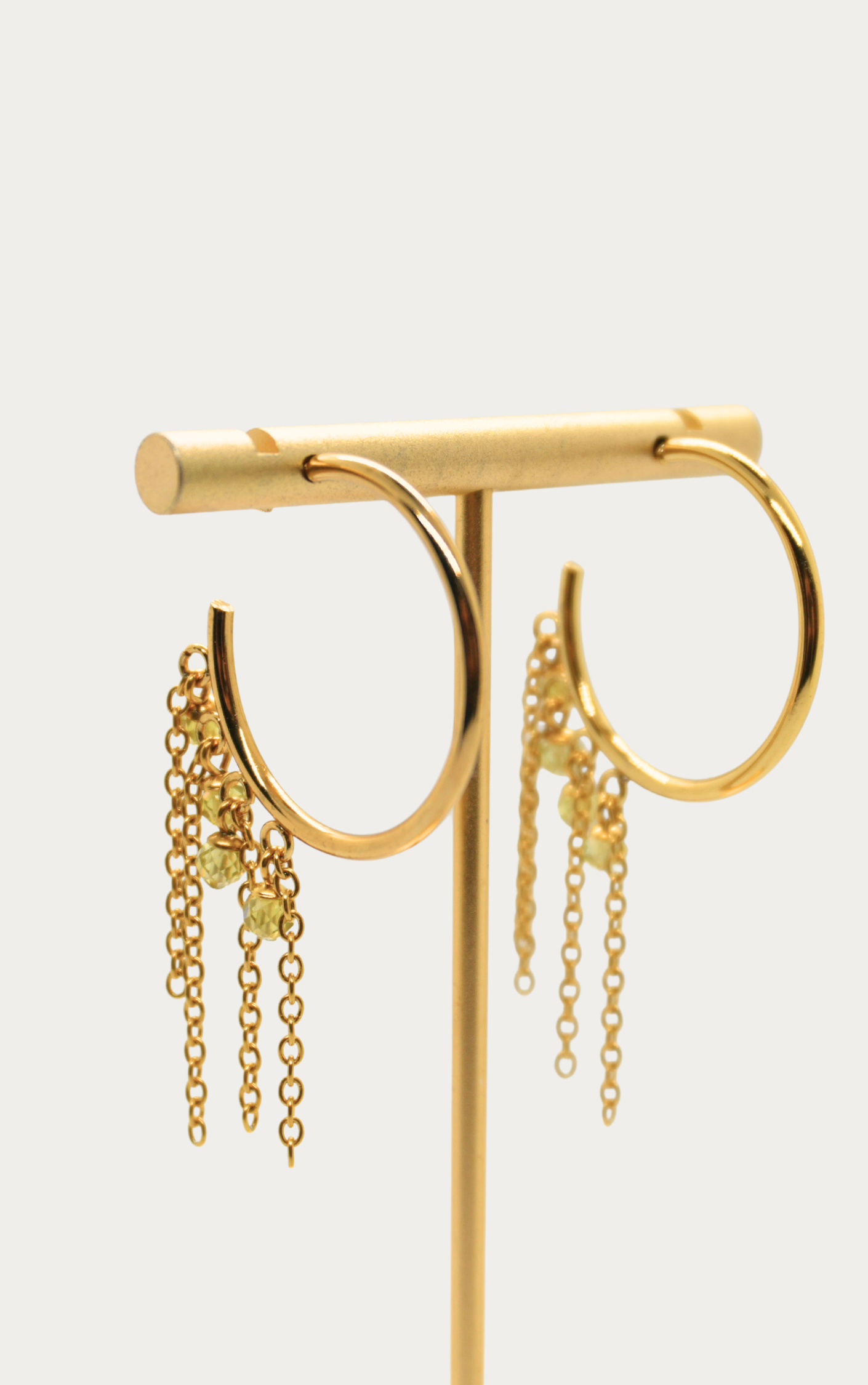 Eyrnalokkar úr gullhúðuðu stáli með keðjum og litlum labradorite stein.